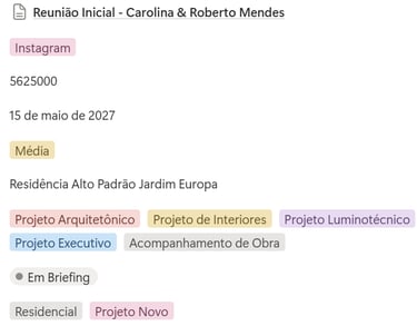 • Navegação com um clique entre Reunião → Briefing → Estilo → Viabilidade → Organograma